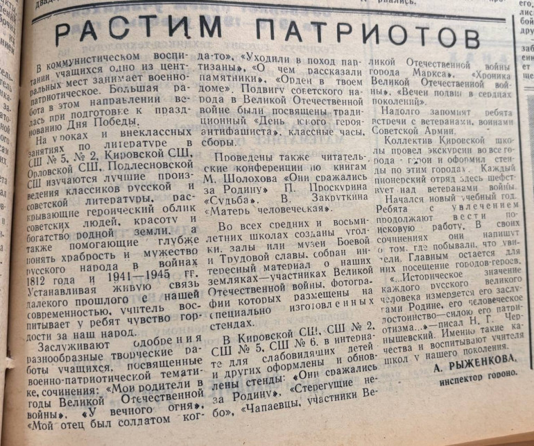 Этот материал написан полвека назад, но многое ли изменилось с тех пор? В 1975 году, пишет автор, педагоги Кировской, Подлесновской и городских школ №2 и №5 делали упор на изучение классической литературы, раскрывающей героический облик советских людей. Школьники писали сочинения на темы: «Мои родители в годы войны», «У вечного огня», «Мой отец был солдатом когда-то», «Уходили в поход партизаны», «О чём рассказали памятники», «Орден в твоём доме».
