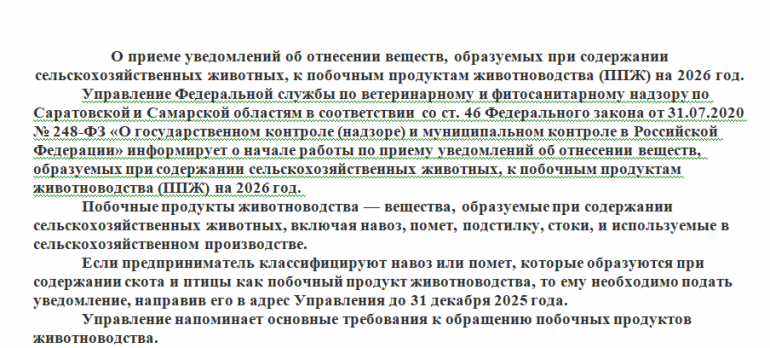 Управление Федеральной службы по ветеринарному и фитосанитарному надзору по Саратовской и Самарской областям в соответствии со ст. 46 Федерального закона от 31.07.2020 № 248-ФЗ «О государственном контроле (надзоре) и муниципальном контроле в Российской Федерации» информирует о начале работы по приему уведомлений об отнесении веществ, образуемых при содержании сельскохозяйственных животных, к побочным продуктам животноводства (ППЖ) на 2026 год.