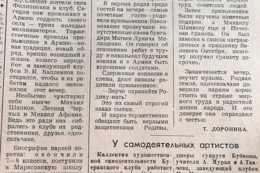 Материал опубликован в газете «Знамя коммунизма» (1965 год). Автор – О.Владимиров. «Закончены последние уроки. Учащиеся Березовской восьмилетней школы отправляются по домам. Выполнив домашнее задание, отдохнув, многие из них вечерами опять приходят в школу. Да и не только вечером, а просто в свободное время. Сейчас здесь часто можно услышать музыку. Репетируется ученический струнный оркестр, руководит которым преподаватель биологии Антонина Никитична Перегородова. Она умеет играть на многих музыкальных инструментах, знает нотную грамоту. Мандолины, гитары, балалайки — все это куплено на деньги, заработанные школьниками в колхозе. А Валя Кабдушев, Коля Китченко и Володя Майер ходят заниматься со своими гармониками. На этом же концерте выступят и члены литературного кружка, которым руководит преподаватель Антонина Михайловна Гладырева. Кружковцы готовят интересную литературную композицию, а впереди — диспуты, вечера вопросов и ответов,вечера, посвященные знаменательным датам.