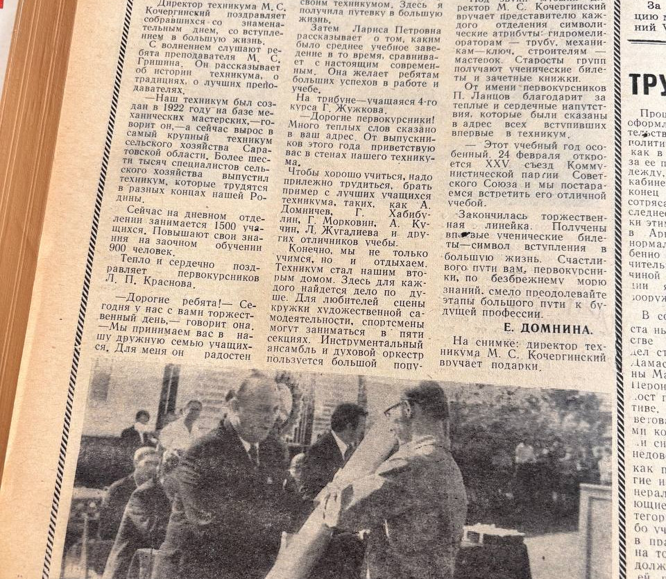 Пятьдесят лет назад в середине сентября на Марксовского территории техникума проходило торжественное посвящение первокурсников. Со знаменательным днём ребят поздравлял директор М.С. Кочергинский. Он вручал представителю каждого отделения символические атрибуты: гидромелиораторам – трубу, механикам – ключ,строителям – мастерок. Старосты групп получили ученические билеты и зачётные книжки. «Наш техникум был создан в 1922 году на базе механических мастерских», -говорил преподаватель М.С. Гришин. «А сейчас он вырос в самый крупный техникум сельского хозяйства Саратовской области. Более шести тысяч специалистов выпустил техникум, которые трудятся на разных концах нашей Родины».