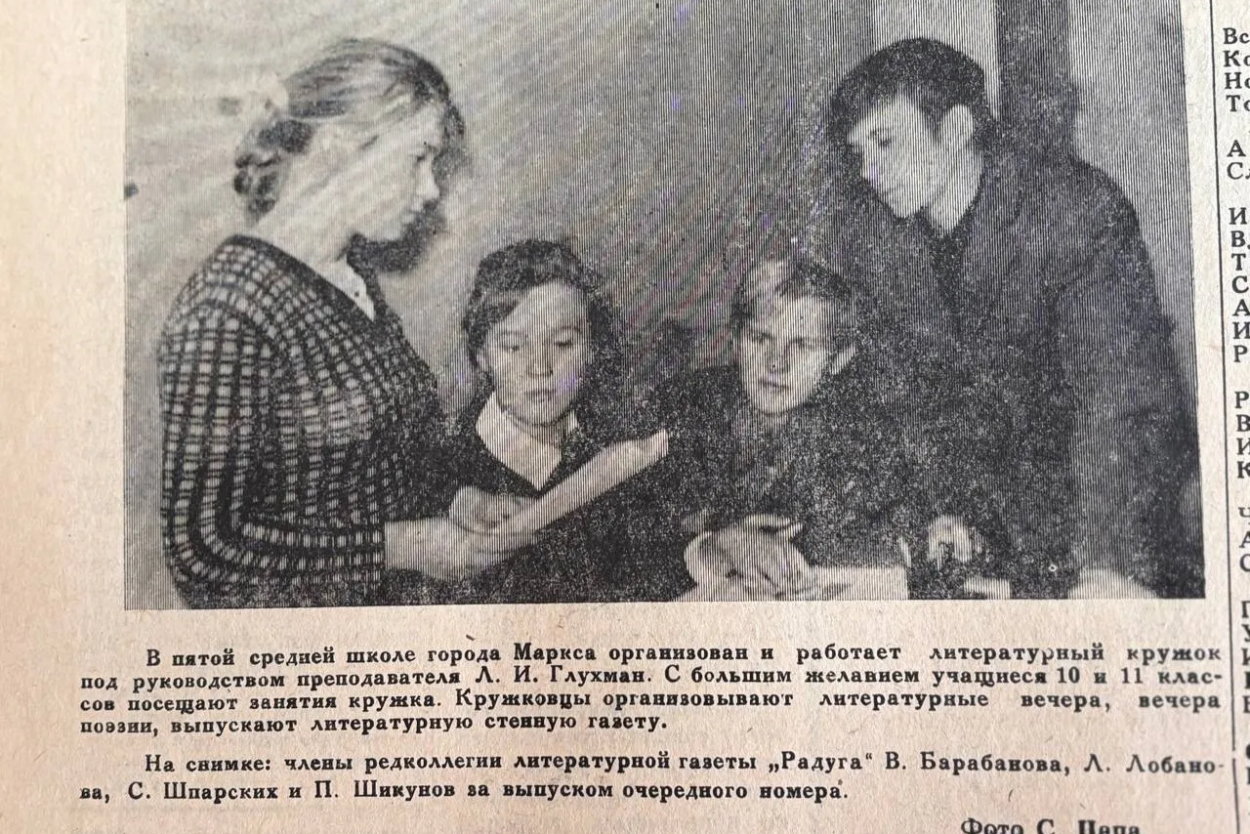 В пятой средней школе города Маркса организован и работает литературный кружок под руководством преподавателя Л.И. Глухман. С большим желанием учащиеся 10 и 11 классов посещают занятия кружка. Кружковцы организовывают литературные вечера, вечера поэзии, выпускают литературную стенную газету.