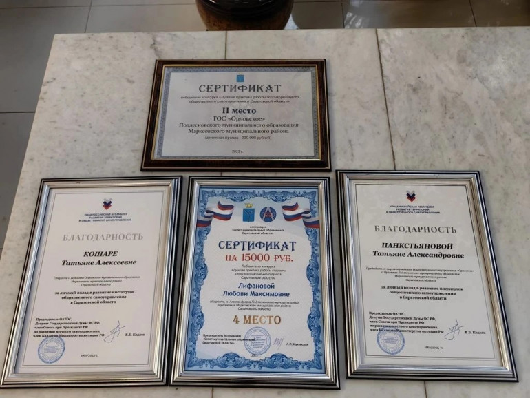 Представители Марксовского района завоевали несколько наград. Глава Подлесновского МО Снежанна Кузьминова удостоена знака «За развитие местного самоуправления». Сертификат победителя конкурса «Лучшая практика работы территориального общественного самоуправления в Саратовской области (II место) получил ТОС с. Орловское с денежным призом в 330 тысяч рублей. IV место и 15 тысяч рублей – у старосты с. Александровка Любови Лифановой. Благодарностью отмечены староста с. Берёзовка Осиновского МО Татьяна Кошара и председатель ТОС с Орловское «За личный вклад в развитие институтов местного самоуправления» Татьяна Панкстьянова. Четвёртое место и денежное поощрение в 15 тысяч рублей в конкурсе «Лучшая практика работы старосты сельского населённого пункта» у старосты с. Приволжское Любови Курчатовой.