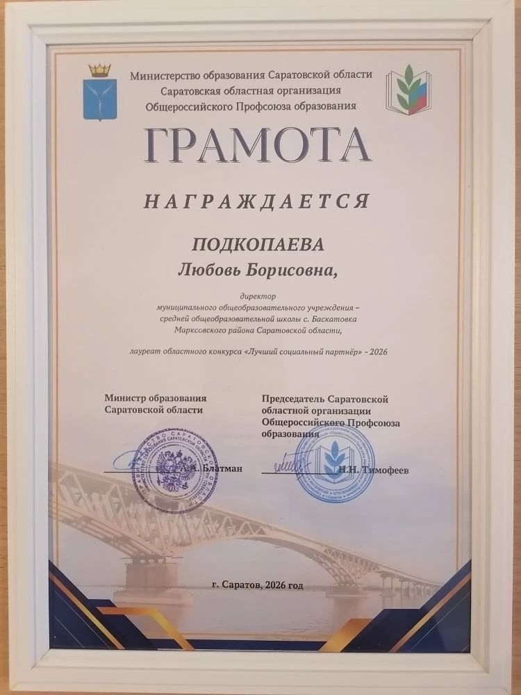 Директор школы села Баскатовка Любовь Подкопаева стала лауреатом престижного областного конкурса «Лучший социальный партнёр — 2026».