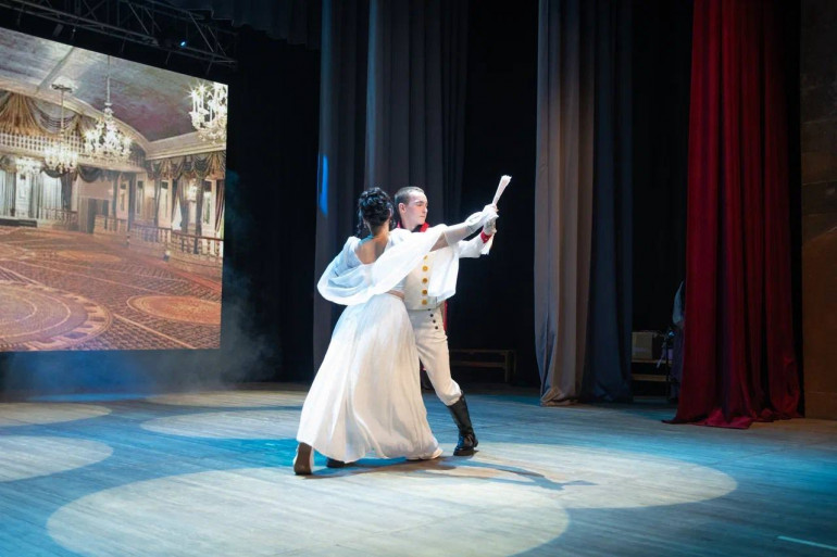 Первый этап конкурса – дефиле в национальных костюмах. Под зажигательную музыку девушки вышли на сцену в разных нарядах. После этого они рассказали о себе и своих корнях в заранее подготовленной видеовизитке. Участницы подошли к этому творчески. Особенно хочется отметить визитку Анастасии Лангер. Настя состоит в патриотическом отряде «Раскат», она неоднократно становилась победительницей различных соревнований.