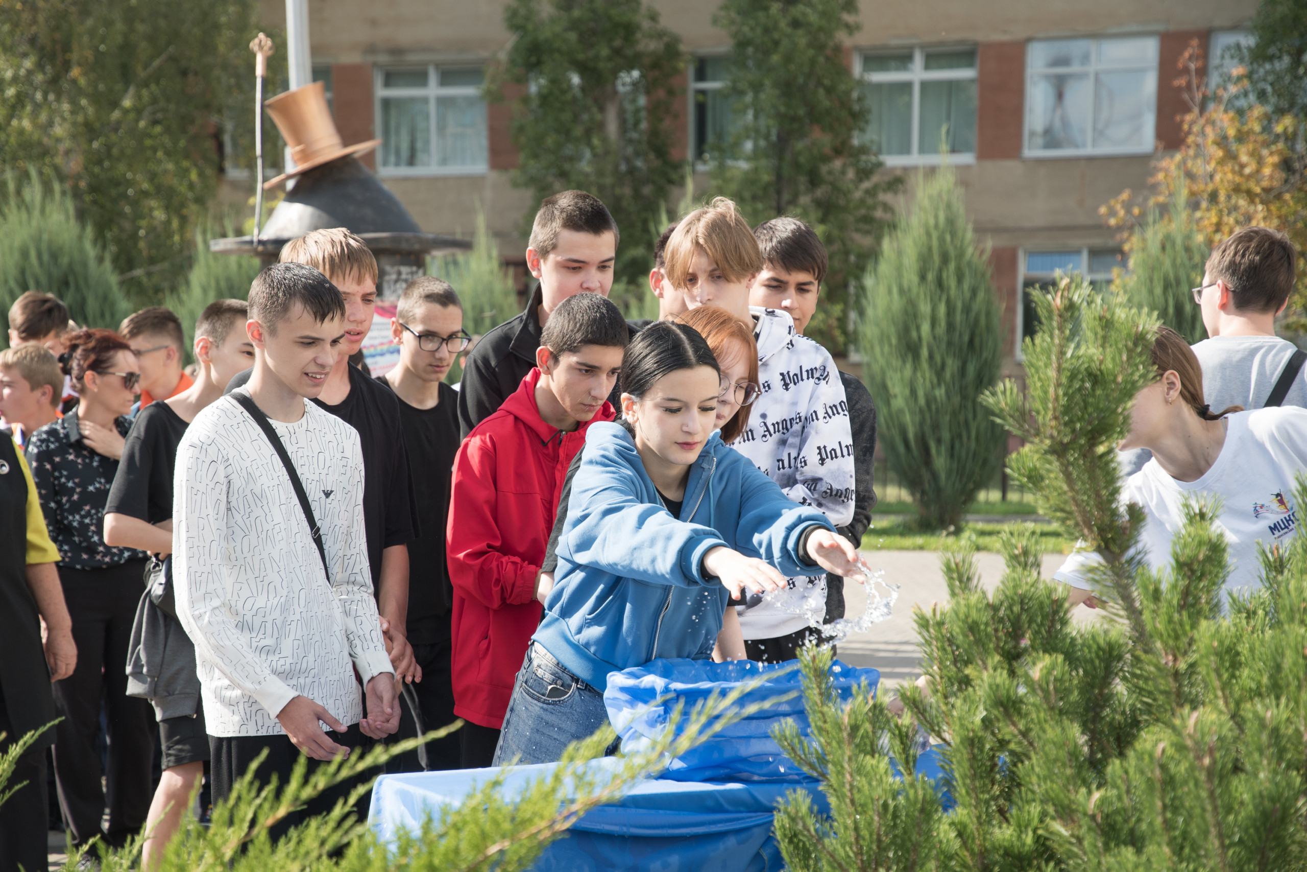 Возле ДК прошла акция «Капля жизни». Каждый желающий мог набрать в ладони воды из чаши, «напоить» ей цветы, отдав дань светлой памяти всем тем, кто безвинно погиб в школе города Беслан в первые дни сентября 2004 года.