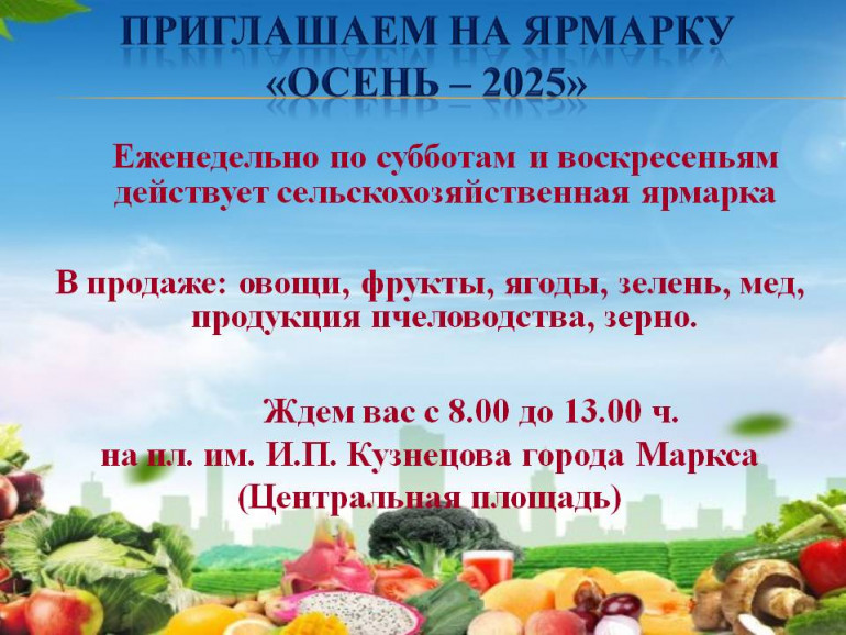 С 13 сентября еженедельно в субботу и воскресенье, с 8.00 до 13.00, на пл. им. И.П. Кузнецова города Маркса (Центральная площадь) начнёт действовать сельскохозяйственная ярмарка «Осень-2025».