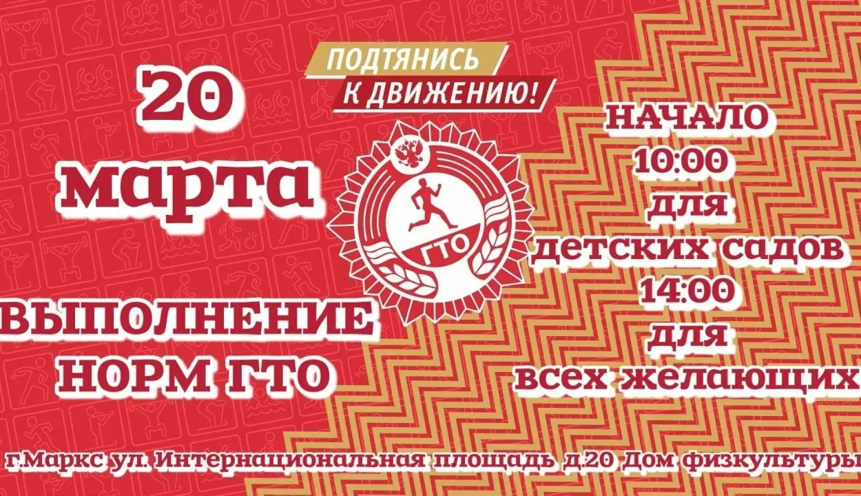 Место: г. Маркс, ул. Интернациональная площадь, д. 20 (Дом физкультуры). ️Дата: 20 марта.