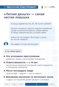 Чтобы помочь детям, родителям и педагогам распознать опасность, МВД России совместно с Федеральным центром «Профилактика» и Институтом Воспитания при участии транспортной полиции подготовили серию графических карточек. В них наглядно разобраны самые распространённые схемы вовлечения несовершеннолетних в преступления.