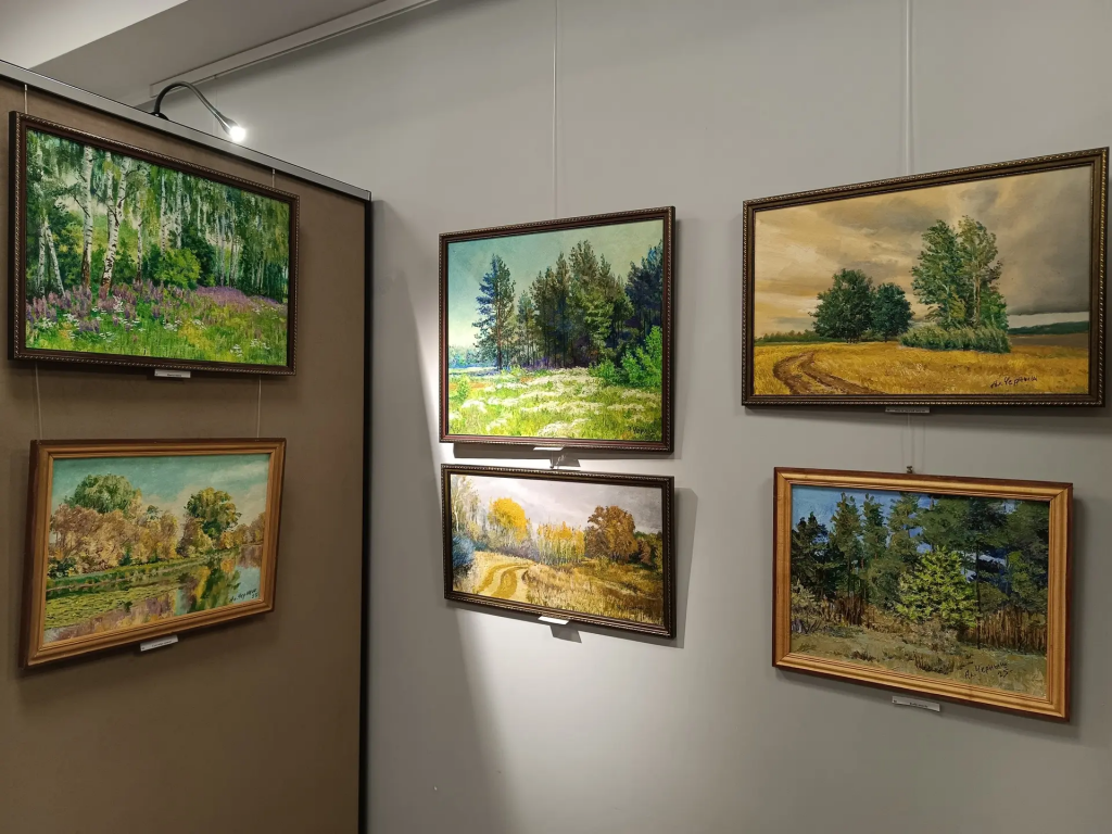 В центре выставки — осенние этюды. Узнаваемые виды города и окрестностей, написанные в сдержанной, лиричной манере.