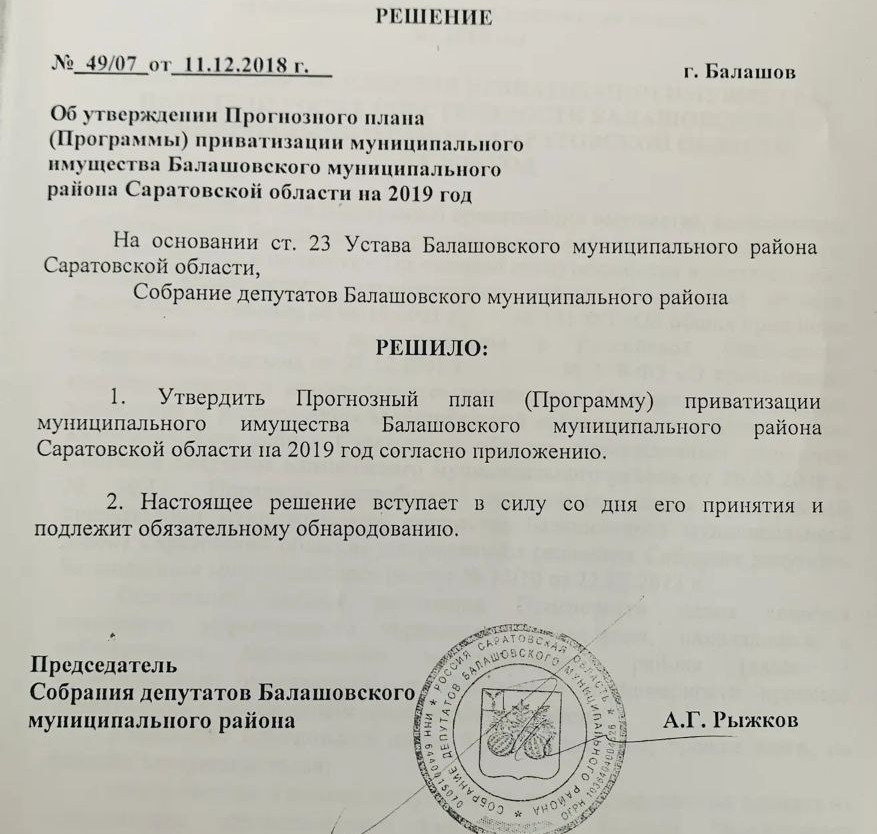 Депутаты Сергей Гладков, Алексей Кольцов, Василий Кравцов, Мария Усова и Дмитрий Лыгин проанализировали вопросы отчуждения имущества в Балашовском районе. В частности, речь идет о решении от 11 декабря 2018 года, подписанном действовавшим на тот момент председателем Собрания депутатов Балашовского муниципального района Андреем Рыжковым. Этим решением в общей массе предлагалось отдать на продажу сразу 13 объектов, в которых ранее размещались учебные заведения или учреждения культуры как в селах, так и в районном центре. Например, здания школы в с. Рассказань, детского сада «Солнышко» в п. Октябрьский, школы в с. Львовка, детсада «Ежик» в с. Хоперское, школы № 4 в Балашове и даже автобус для перевозки детей. Кроме этого, в списках был и ранее переданный муниципалитету комплекс зданий военной части: казармы, кухня-столовая, банно-прачечный комплекс, учебные мастерские, учебный корпус с классами на 300 мест.