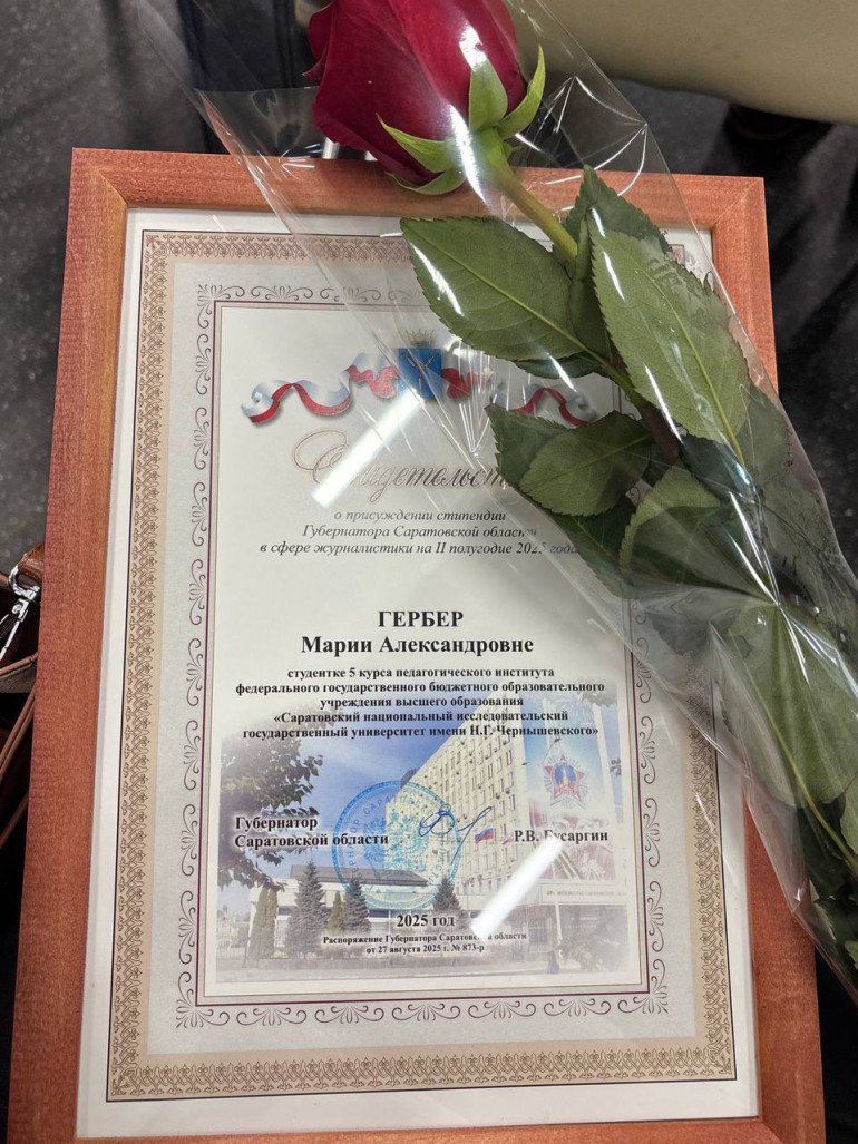 Церемония награждения прошла в историческом парке г. Саратова «Россия – Моя история» в День российской печати. На мероприятии чествовали представителей СМИ нашего региона. Свидетельство о присуждении стипендии Марии вручил вице-губернатор Михаил Орлов.