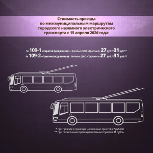 — по регулируемым тарифам изменения коснутся 35 маршрутов (подробности смотрите в карточках). Они рассчитаны по стоимости 2,78 рубля за 1 км. Среди них также троллейбусный маршрут «Саратов-Энгельс» Так, на троллейбусном маршруте № 109 стоимость билета будет 31 рубль.