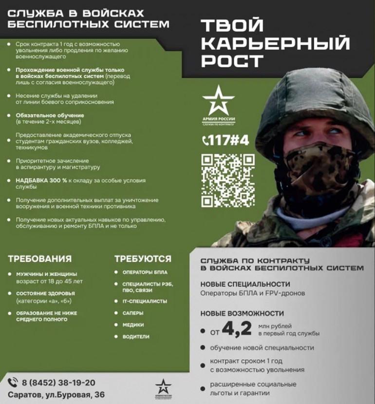В пункте отбора на военную службу по контракту города Саратова рассказали об особых условиях службы по контракту в войсках беспилотных систем (БпС) — новом роде войск Вооруженных сил России.